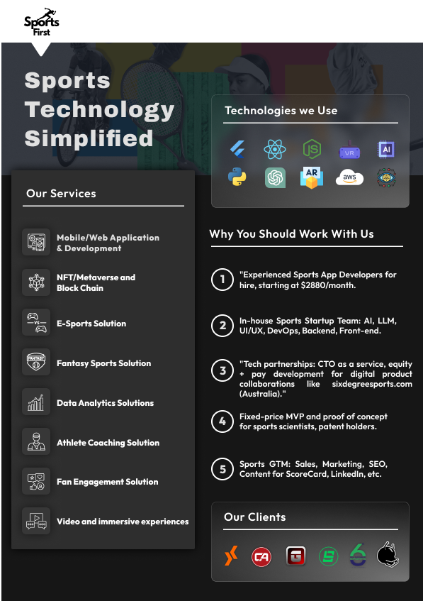 SportsFirst is a premier sports technology consulting and development studio with a focus on delivering cutting-edge solutions for the global sports industry. Founded with a mission to revolutionize how sports organizations operate, we provide a wide range of services, including AI-powered athlete onboarding, data analytics for performance optimization, immersive fan engagement experiences, and venture support for sports startups.